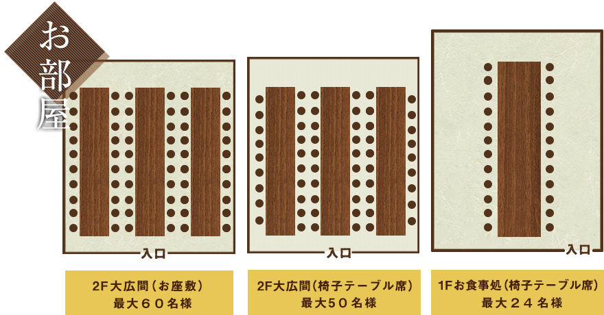 松風荘自慢の大広間は最大60名様までご宴会可能な広々空間。宗像で大人数でのお食事・会食の際にはぜひ神湊の松風荘へお越しください。 その他10名様、20名様と人数に合わせて大小のお部屋のご用意が可能ですので、様々なご宴会シーンでご利用ください。基本的にはお座敷席をご用意しておりますが、テーブル・イスのご用意も可能です(最大50名様まで)。テーブル席でのお食事をご希望の場合はお気軽にお申し付けください。